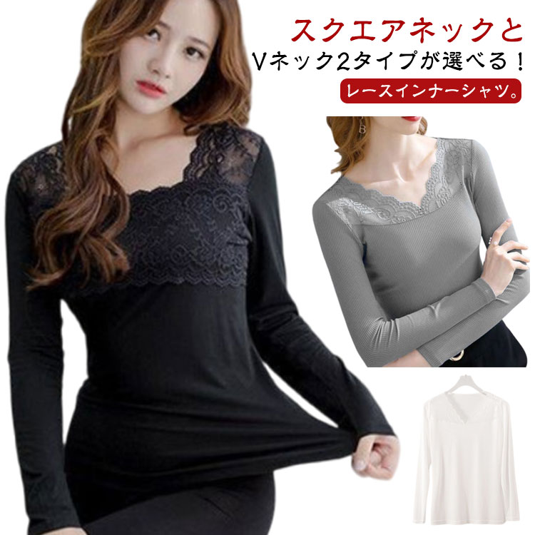 レディース 肌着 長袖tシャツ インナーシャツ 着回し 長袖 カットソー レース 花柄レース Vネック トップス インナー 伸縮 ストレッチ レースインナー きれいめ スクエアネック 肌隠し