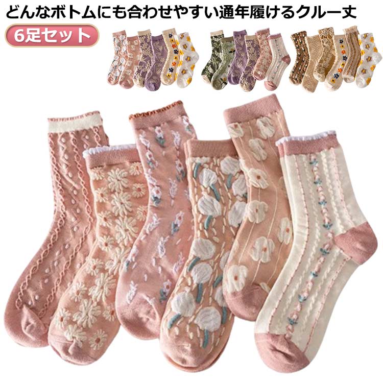 靴下 レディース 6足セット 花柄 北欧デザイン クルー丈ソックス カラフル かわいい 女性用 くつした おしゃれ 抗菌 通気性 綿 オシャレ 春夏秋冬 コットン お花 防寒 可愛い 立体的