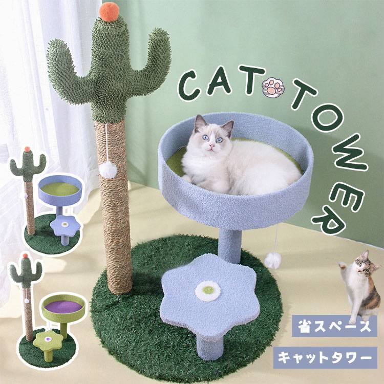 キャットタワー 省スペース 据え置き型 猫用爪とぎポール サボテン型 猫タワー ネコポール 麻縄 運動不足 つめとぎ 天然麻紐 耐久 組立簡単 支柱 ミニ 低い 遊び場 おもちゃ 昼寝タワー