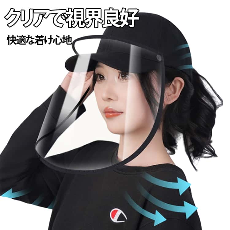 雨の日も顔が濡れず視界を確保する、取り外し可能なクリアバイザー付き帽子です。