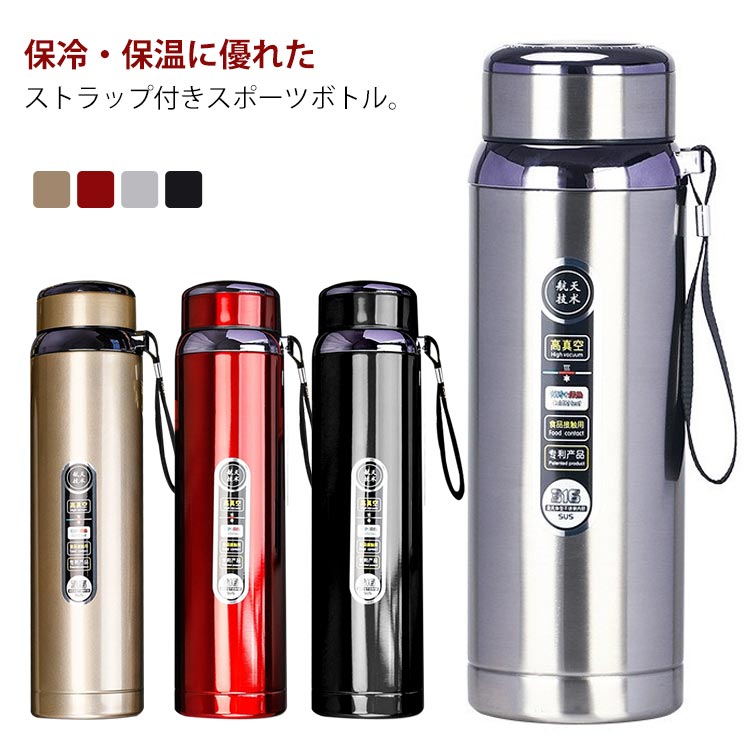 保冷 水筒 1リットル 保温 スポーツドリンク対応 マグボトル 真空断熱 500ml 800ml 1000ml ストラップ付き 車載 ドリンクホルダー対応 ドライブ 部活 アウトドア ステンレスボトル
