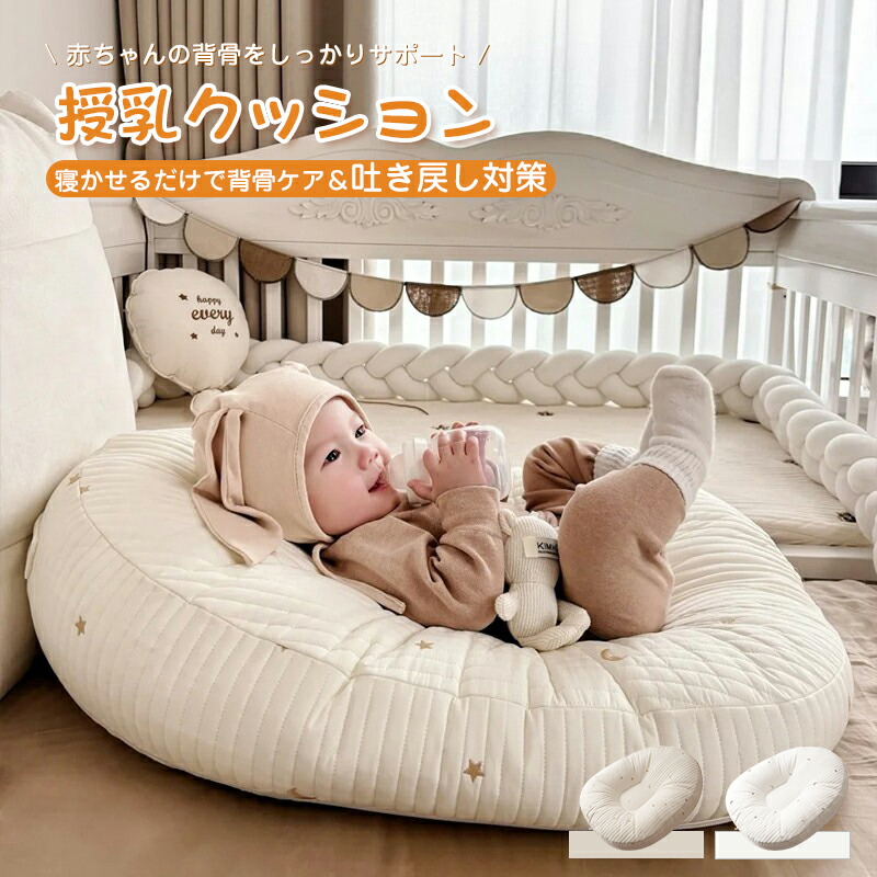 カーブ形状で吐き戻しを防止する多機能ベビークッション。抗菌綿使用で清潔を保持、防水加工でお手入れ簡単。授乳から寝かしつけまで成長をサポート、コンパクト