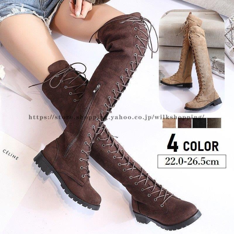ニーハイブーツ ロングブーツ レディース 靴 レースアップ 膝上 スエード調 編み上げブーツ 履物 くつ 女性用 ローヒール 美脚効果 防寒 婦人用