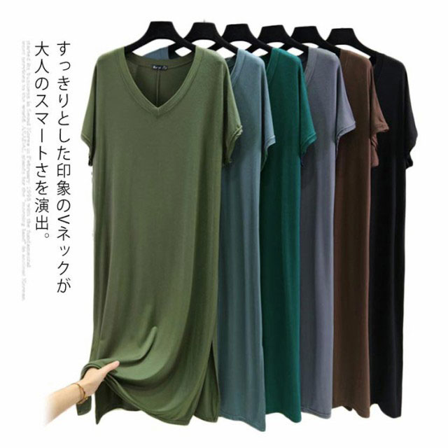 tシャツワンピース ワンピ ワンピース Aライン フレンチスリーブ 半袖 Vネック レーヨン シンプル 無地 ミモレ丈 膝下丈 ルームウエア 部屋着 20代 30代 40代 レディース