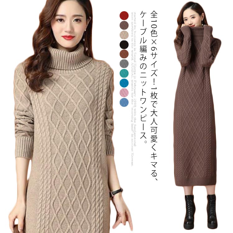 全10色×6サイズ ニットワンピースニットワンピタートルネックワンピースニットケーブル編みオフタートル秋秋冬大きサイズ膝下丈防寒無地おしゃれ女性