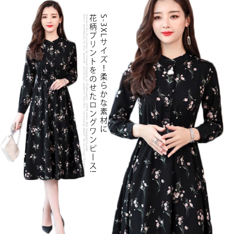 ワンピース 花柄 長袖ワンピース ミモレ丈 プリントワンピース カジュアル 春 夏 秋