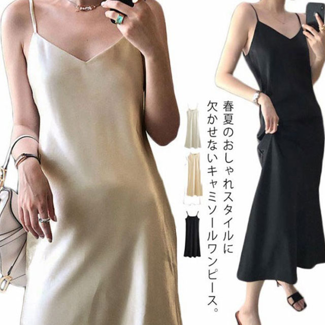 全3色×6サイズ シルクタッチ キャミソールワンピース ロング丈 スリップ ワンピース キャミワンピ キャミワンピース Aライン ドレス 春夏 おしゃれ インナー