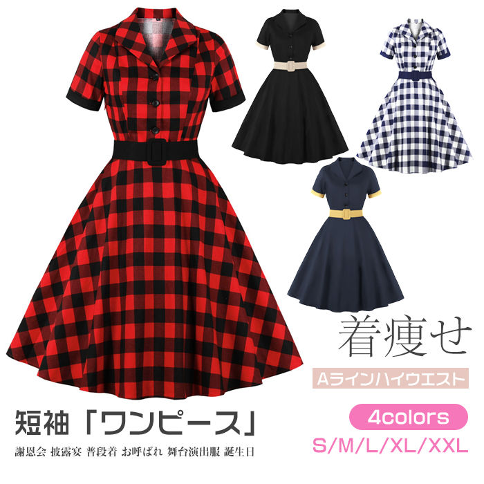 謝恩会 スイングワンピ お呼ばれ 50年代 ハイウエスト 着痩せ ロカビリー 短袖 結婚式 レトロワンピース S-2XL 4色 チェック柄