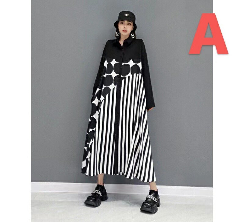 シャツワンピース レディース ワンピース ロング ゆったり 大きいサイズ ドット柄 ストライプ柄切替ロングワンピース ゆるっとワンピース 春 夏 秋 長袖