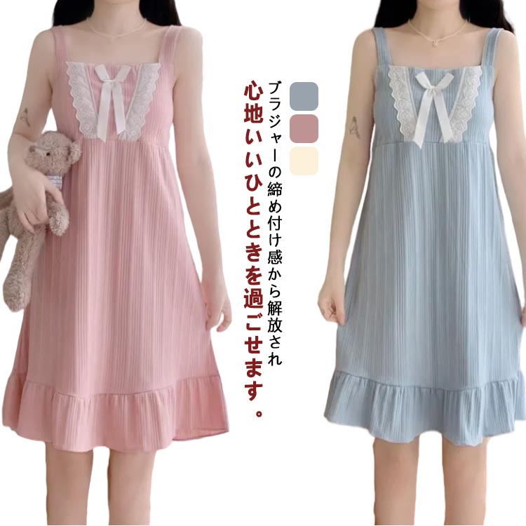 パジャマ レディース ノースリーブ 夏 ワンピース ガールズ 可愛い キャミソール カップ付き レース 高校生 女の子 無地 部屋着 ナイトウェア 寝間着 大人 学生 ルームウェア ネグリジェ