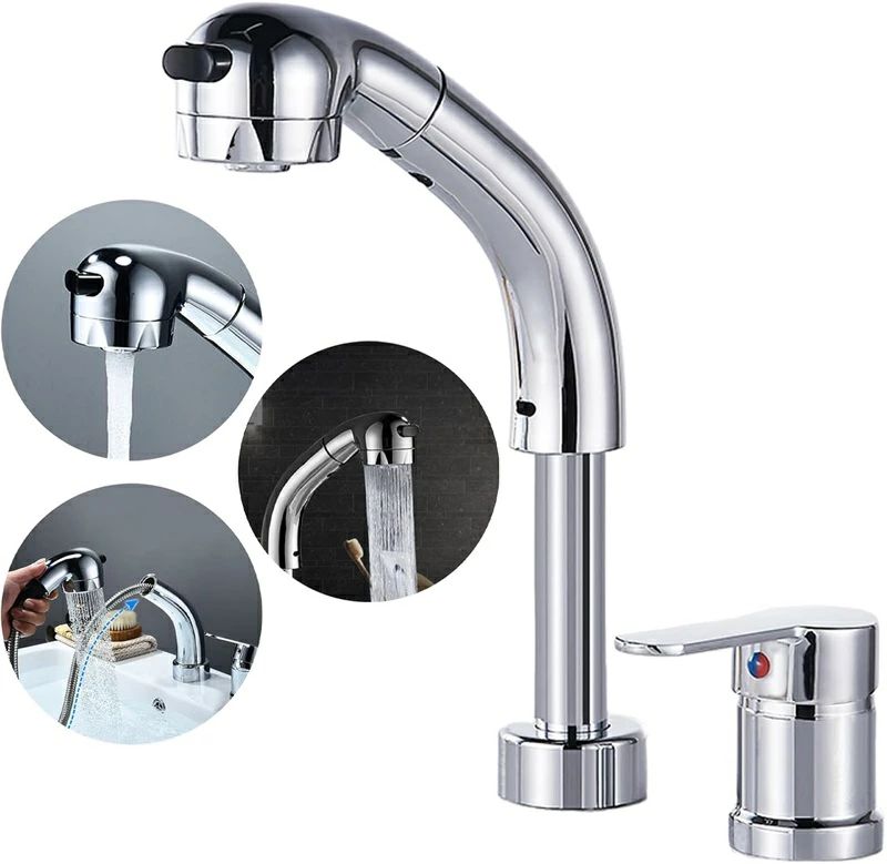 洗面台 蛇口 2穴 浴室用水栓 スプレー 引き出し式 水栓 高さ調節可能 360°回転ノズル 洗面水栓 クローム 冷水ホース付き シャワー 混合栓 温水