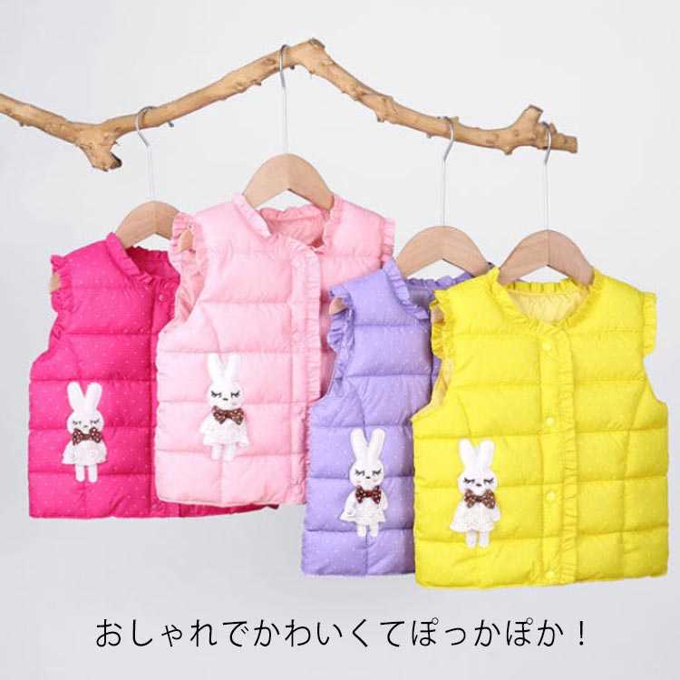 キッズ ダウンベスト 子供服 女児 ノースリーブ フリルネック ウサギ 可愛い 保温 ベスト 女の子 中綿ベスト ジャケット インナーダウン 暖かい 防寒着 通園 通学 秋冬 ガールズ