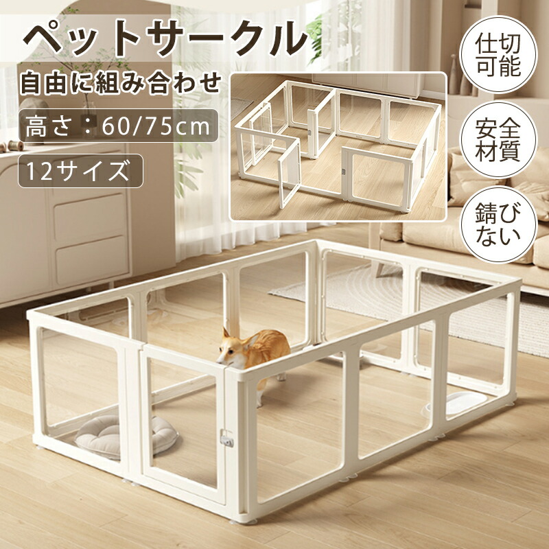 ペットサークル ドア付き フェンス 透明 半透明 クリア アクリル製 犬用サークル ペットケージ 室内用 檻感なし 自由組み合わせ 小型犬 中型犬対応 高密度HDPE素材 高さ60cm