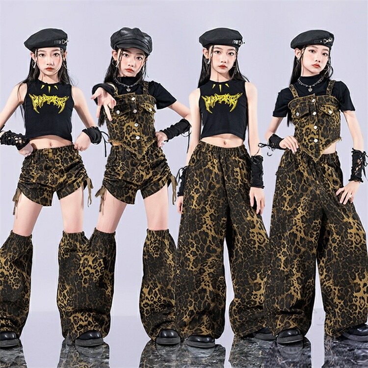 キッズ ダンス 衣装 ヒョウ柄 セットアップ 練習着 ステージ 上下 子供服 ガールズ 女の子 かっこいい 応援団 チアダンス ジャズダンス ダンスウェア 演出服 へそ出し レッグ ファッション