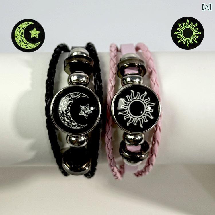 ブレスレット 男女兼用 夜光 蓄光 日月モチーフ 月光石 ペア カップル お揃い レザー 革 手編み 編み込み 腕輪 ファッション 普段使い おしゃれ カジュアル アクセサリー