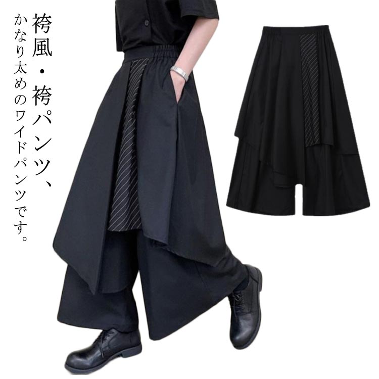 ガチョウパンツ 無地 レディース アシメトリー ウエストゴム カジュアル メンズ ワイドパンツ 袴パンツ 男女兼用 重ね着風 ビッグシルエット 黒 ブラック オシャレ サルエルパンツ リラックス 和風