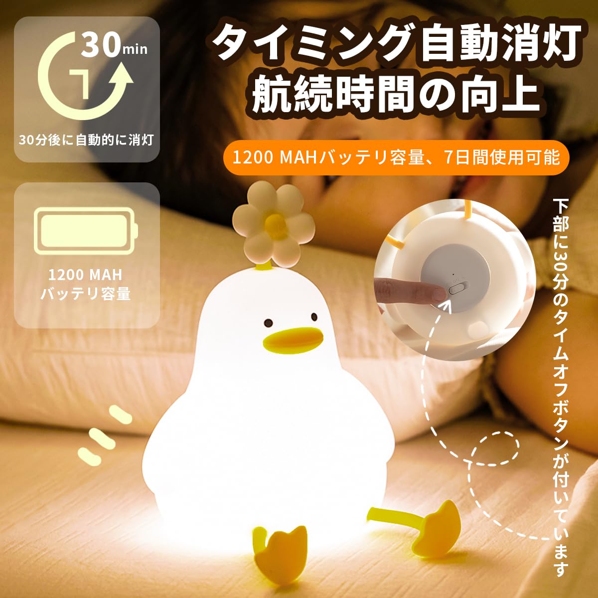 ナイトライトアヒルのヘッドランプシリコ 全7色 の切り替えが可能です 暖色光のみの3段階調光が可能です