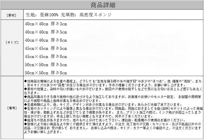 クッション 40cm×40cm 45c 01 02 03 04 05 06 07 08 09 10 11 12 13 14 40cm×40cm 厚さ3cm 40cm×40cm 厚さ5cm 40cm×40cm 厚さ8cm 45cm×45cm 厚さ5cm 45cm×45cm 厚さ8cm 50cm×50cm 厚さ5cm 50cm×50cm 厚さ8cm