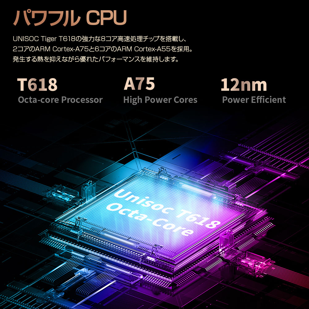 UNISOC Tiger T618の強力な8コア高速処理チップを搭載し、2コアのARM Cortex-A75と6コアのARM Cortex-A55を採用。発生する熱を抑えながら優れたパフォーマンスを維持します。