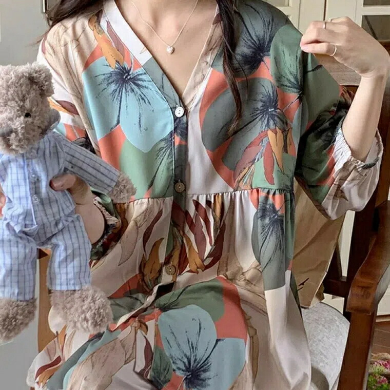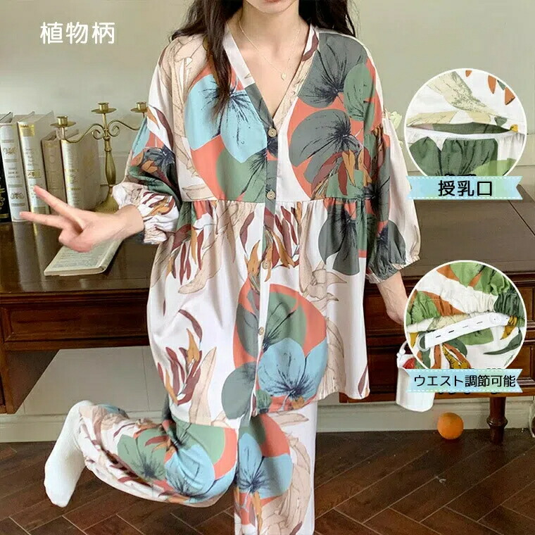 マタニティパジャマ 授乳口つき 半袖 キッズ ベビー マタニティ 人気 千鳥格子チェック 植物柄 M L XL 2XL 3XL