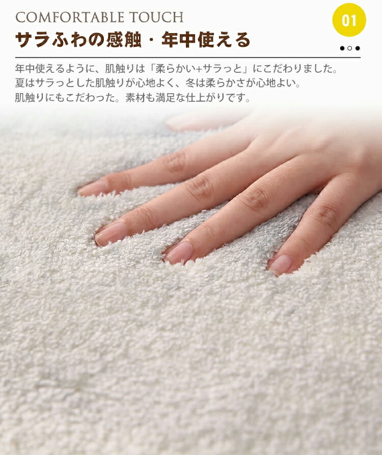吸水性・通気性・保温性に優れているので夏はサラリと、冬はフワフワで季節を問わず心地よくお使いいただけます。