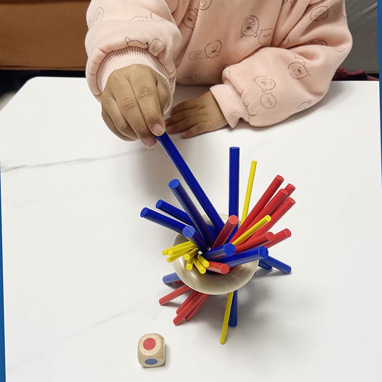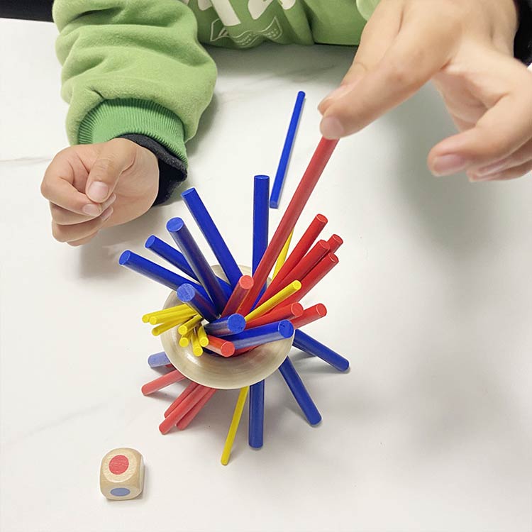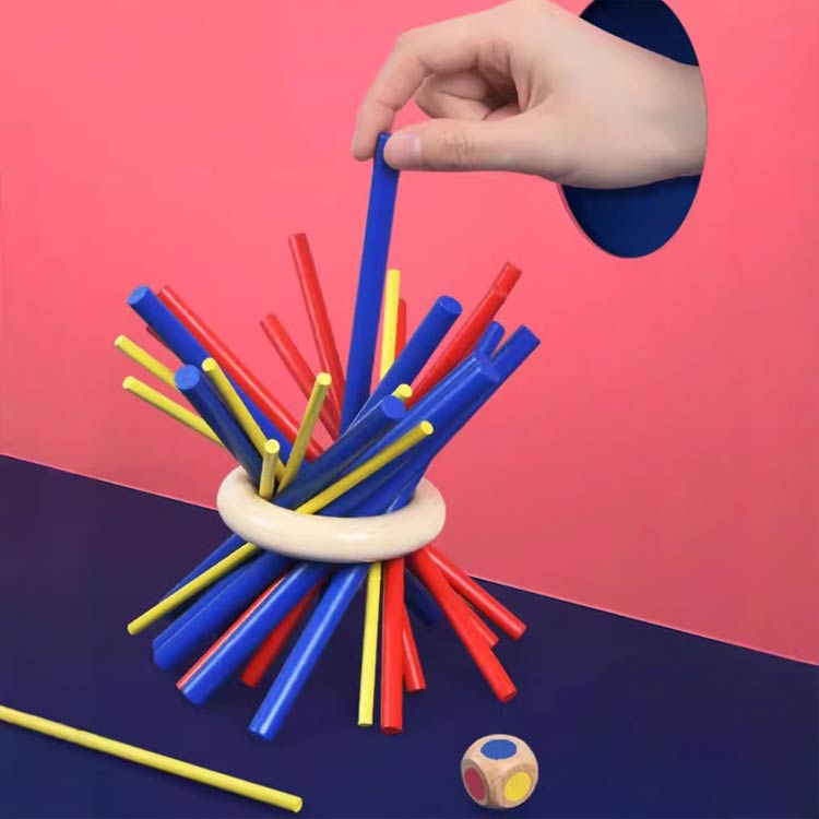 29点セット:赤スティッキー9本、黄スティッキー9本、青スティッキー9本、リング1個、サイコロ1個。遊び方の説明1、全てのスティックを束にして片手で握ってください。2、木の輪を束の上から通して真ん中まで下ろし、ゆっくりと束から手を離して下さい。3、全体が動かなくなったら、ゲーム準備が完了です。4、プレーヤは順番にサイコロを投げて下さい。5、全体が崩さないように注意しながら出たサイコロの色のステイックを取り出して下さい。6、全体が崩したら(または、スティックが3本しか残らなかった場合)ゲームは終了します。全員は自分の得点を計算し、最も得点が高い人は勝ちです。