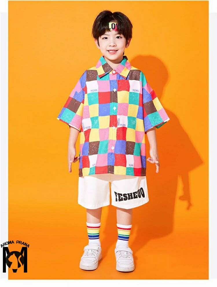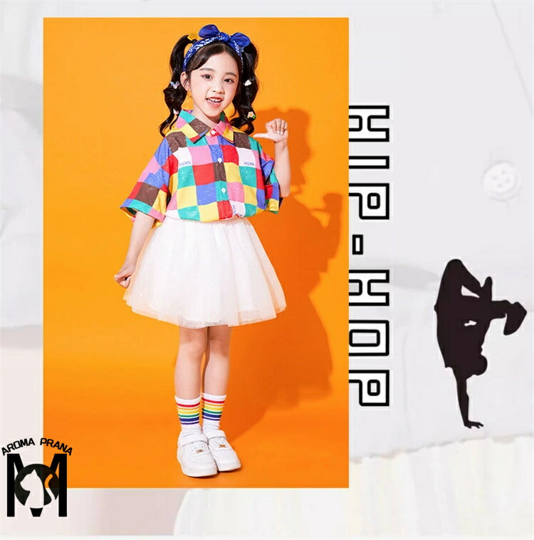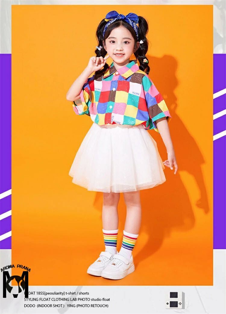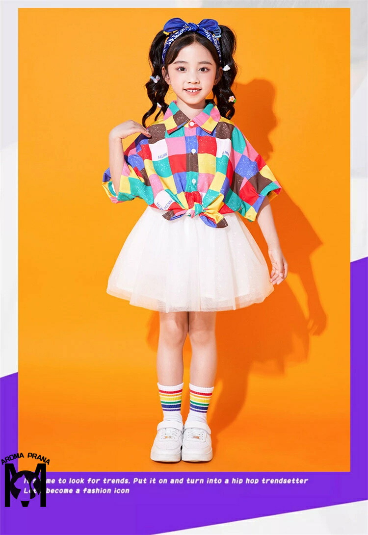 虹色 キッズダンス衣装 セットアップ チェック柄 チアガール パンツ スカート シャツ k-pop 衣装 半袖 カラフル ヒップホップ 男の子 女の子 韓国 カッコイイ 子供 演出服 ジ キッズダンス