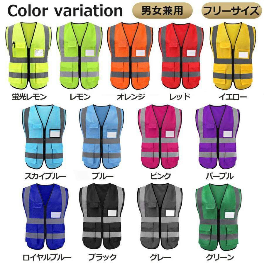 13色5ポケット付 安全ベスト 反射ベ 蛍光レモン レモン オレンジ レッド イエロー スカイブルー ブルー ピンク パープル ロイヤルブルー ブラック グレー グリーン