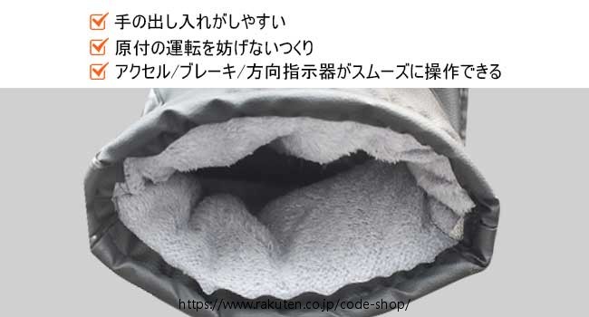 【着脱簡単&運転を妨げない】事故や転倒の際、咄嗟にハンドルから手を離せないという2次災害的事故が発生という問題を減らすために、お客様の要望が応じて手首開口部が広く製品を開発しました!手首開口部分が広くて、自由に抜き差しに支障が少なくなっています。走行中にヘルメットのバイザーを開け閉めしたり、ミラーの角度調整をしたりといった運転の癖がある方に適合ます。また、ハンドルカバー内の可動域が広くて、アクセル、ブレーキはもちろん、方向指示器(ウィンカー)を出す際にスムーズに操作します。運転を妨げない!