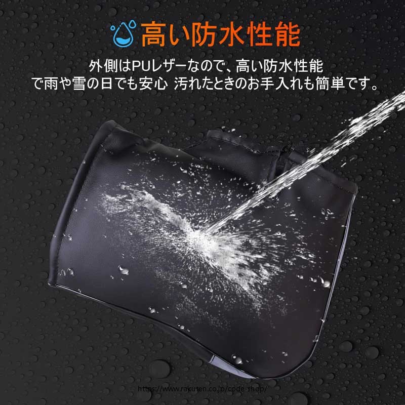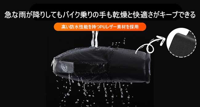 【PU素材&防水】雨の日に手元が濡れ、操作に支障が出る可能性あることを考慮し、本製品は表面に高い防水性能を持つPUレザー素材を採用して急な雨が降りしきってもバイク乗りの手を確実に保護して手はいつでも乾燥して快適さをキープします。ミラー開口部には穴のない設計が採用されており、伸縮コードによって取付口の寸法を調整することで、水が穴に沿って下に浸透する心配がない。