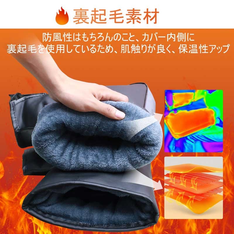【裏起毛&防寒】寒い冬の日に指先が凍りつき、走行難しくなることがあります。寒さから指先を守るために、裏起毛ハンドルカバーが登場しました。表面にに防水性の高いPUレザー素材で覆われており、裏地には保温発熱するフリース素材が使用されて熱が溜められます。冷たさからくる凍結や指の動きの制限を解消し、冷たい風や寒さからくる不快感を排除し、快適で安全な冬のバイクライディングを楽しむことができます。寒冷な天候下でも暖かさと快適さを提供し、バイクライディングのシーズンを楽しむお手伝いをいたします。
