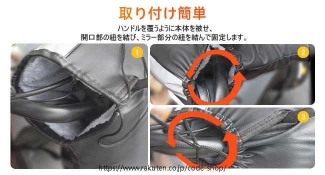 【ミラー開口部調節可&多車種汎用型】ハンドルを覆うように本体を被せ、開口部の紐を結び、ミラー部分の紐を結んで固定します。 適用範囲:PCX125 PCX150 ADV150 CT125 スーパーカブ110 フォルツァ リード125 PCX160 クロスカブ110 ディオ110 スーパーカブ C125アドレスV125 アドレスV125G アドレス125 バーグマン200 アドレス110 スウィッシュNMAX125 シグナスX アクシスZ マジェスティS XMAX トリシティ125 マジェスティ125 まだ記載されていない実は適用車種もあります