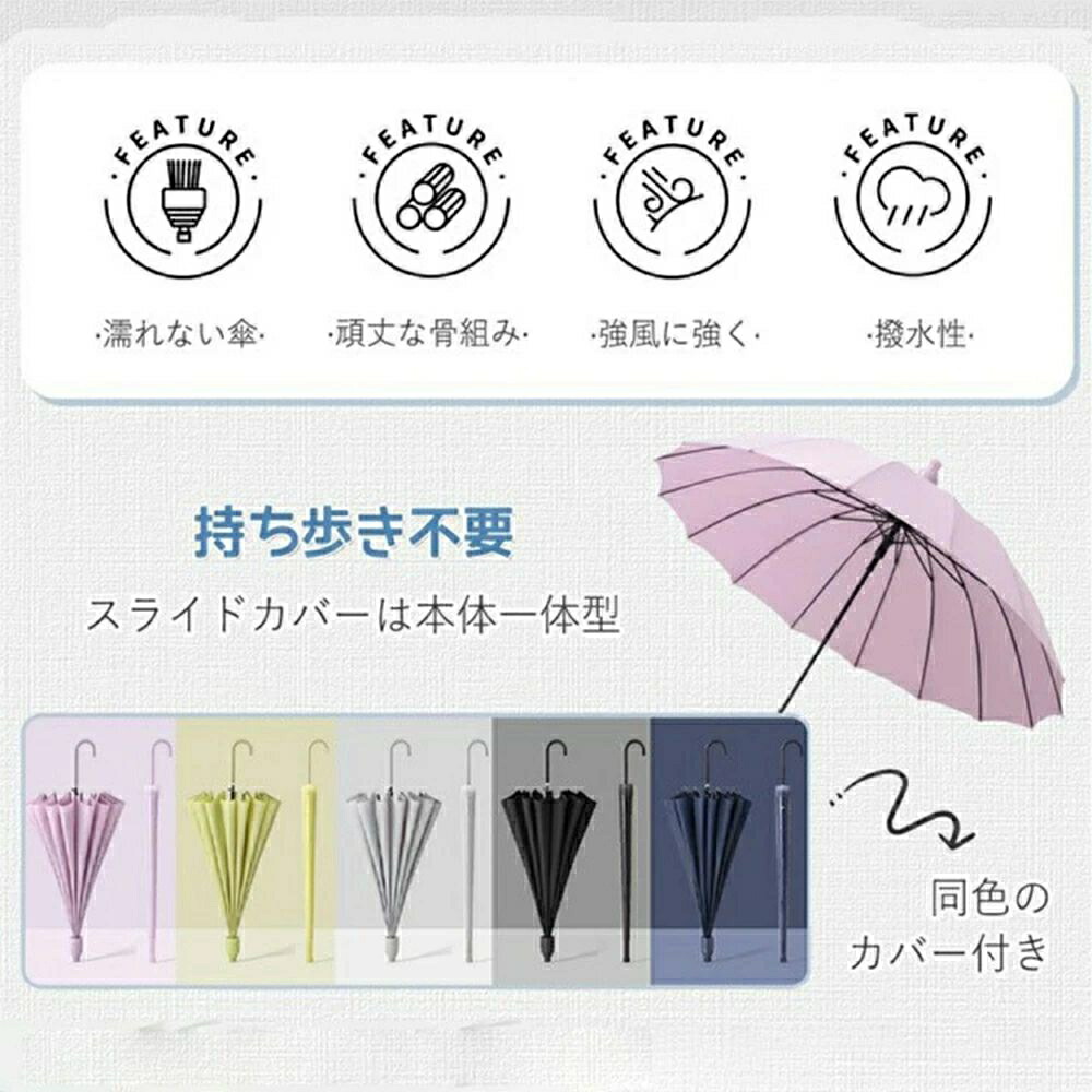 カバー付き傘 16本骨 伸縮スライドカバー付き 傘 レディース メンズ かさ 長傘 風に強い 防水 ワンタッチ 頑丈 丈夫 撥水 日焼け防止 紫外線対策 グラスファイバー 軽量
