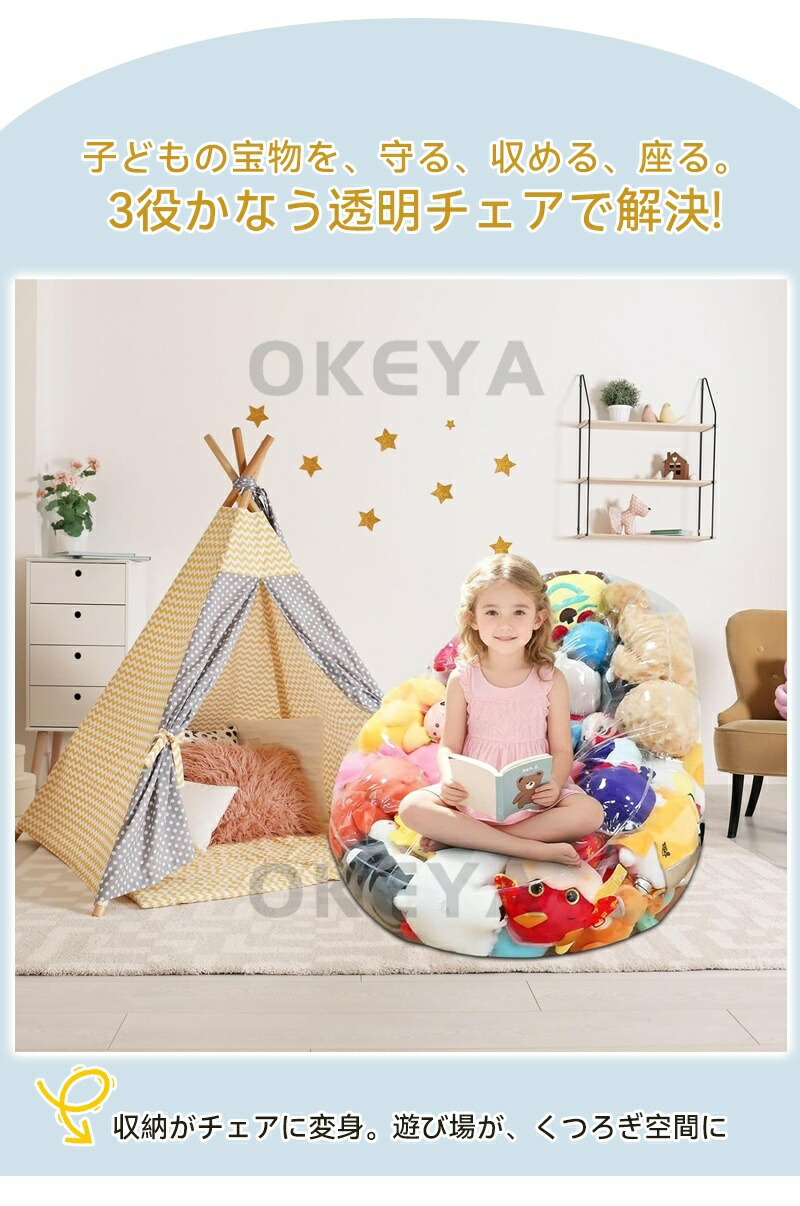お子様の大切なぬいぐるみが増えすぎて置き場に困っていませんか ほこりがたまって掃除が大変、部屋中に散らばって片付かない、そんなお悩みを一気に解決する画期的な収納家具が登場です。本品は透明なPVC素材で作られた、ぬいぐるみ専用収納チェア。中身が一目で見える透明設計で、お気に入りの1体を探す手間がなく、ストレスフリーな収納を実現します。さらに、中身を入れたまま柔らかいビーンバッグチェアとしても使用できる多機能アイテムです。