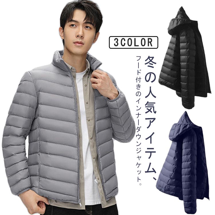 ライトダウン メンズ 中綿ジャケット フード付き 防寒 ダウンジャケット ファイバーダウン 軽量 細身 薄手 ジャケット 保温 暖かい インナージャケット ダウン インナー ファイバー