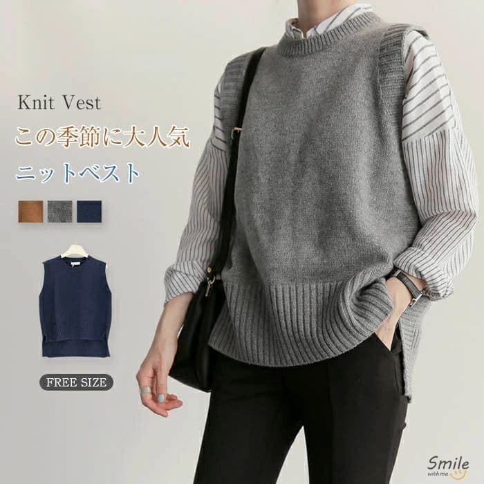ニットベスト ニット ベスト レディース 春 秋 冬 秋冬 トップス ノースリーブ 重ね着 あったか おしゃれ カジュアル シンプル 無地 スリット レイヤード クールネック グレー 50代 3 紺色