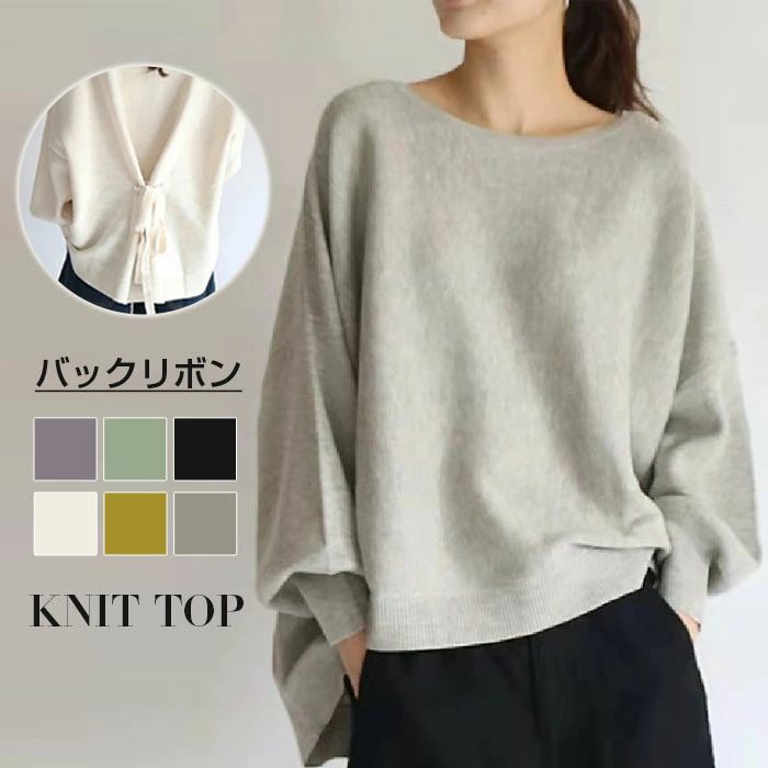 ニットトップス レディース ボリューム袖 バックリボン セーター ニットセーター ラウンドネック バルーン袖秋 春 ふわ袖 ゆるニット 冬