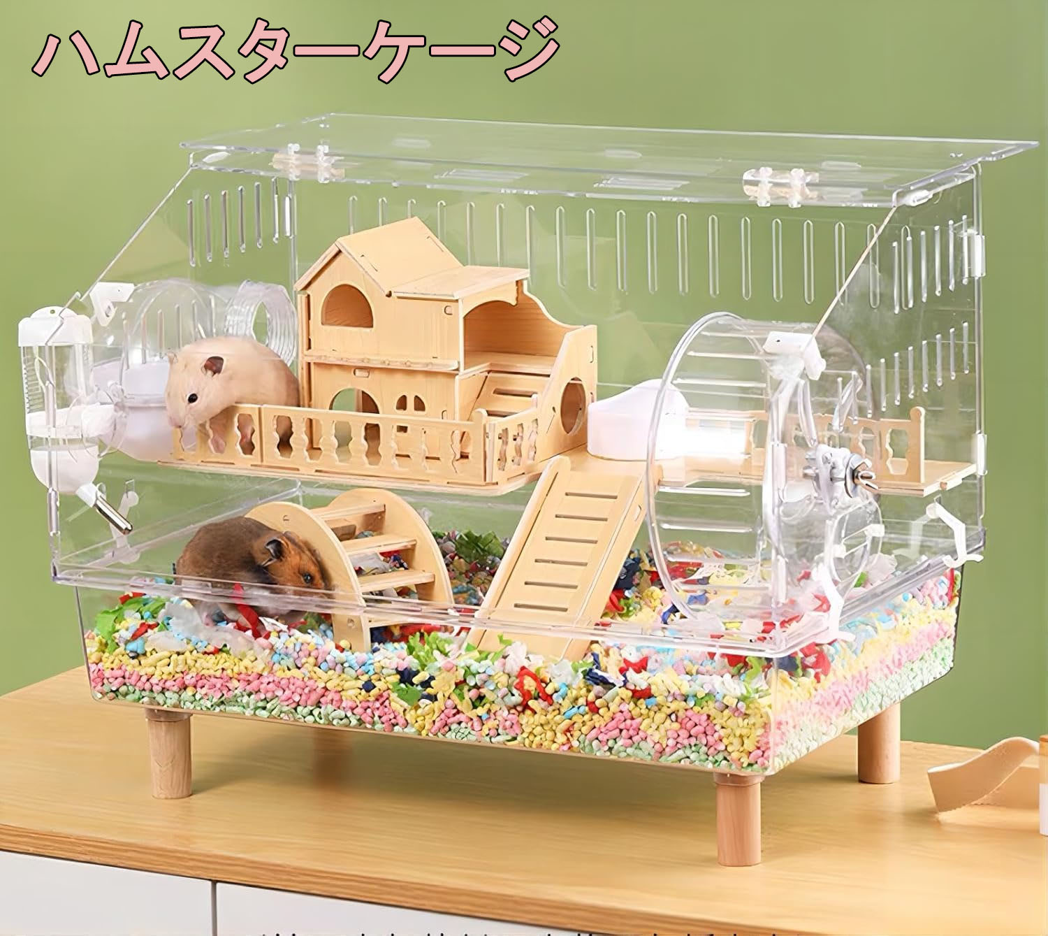 ハムスターケージ 透明 アクリル製 2階建て ハムスター ハウス 飼育ケージ 小動物ケージ 広い空間 持ち運び 組立簡単 給水ボトル 回し車 お風呂 など 9点セット 飼育小屋 快適 便利 小動物用品