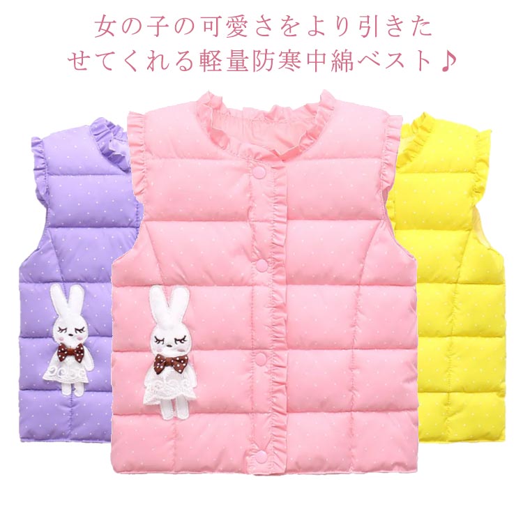 キッズ ダウンベスト 子供服 女児 ノースリーブ フリルネック ウサギ 可愛い 保温 ベスト 女の子 中綿ベスト ジャケット インナーダウン 暖かい 防寒着 通園 通学 秋冬 ガールズ