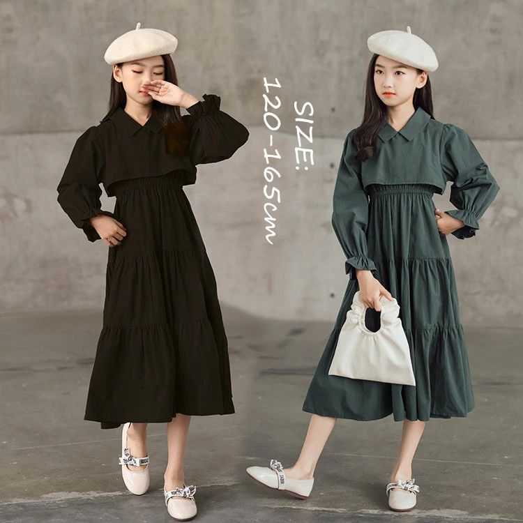 韓国子供服 ワンピース 女の子 女児 ママ レディース ロング丈ワンピース 長袖 春秋冬 おしやれ 可愛い 無地 キッズ ことも服 ジュニア服 Aラインワンピース ブラック グリーン ドレスワンピース