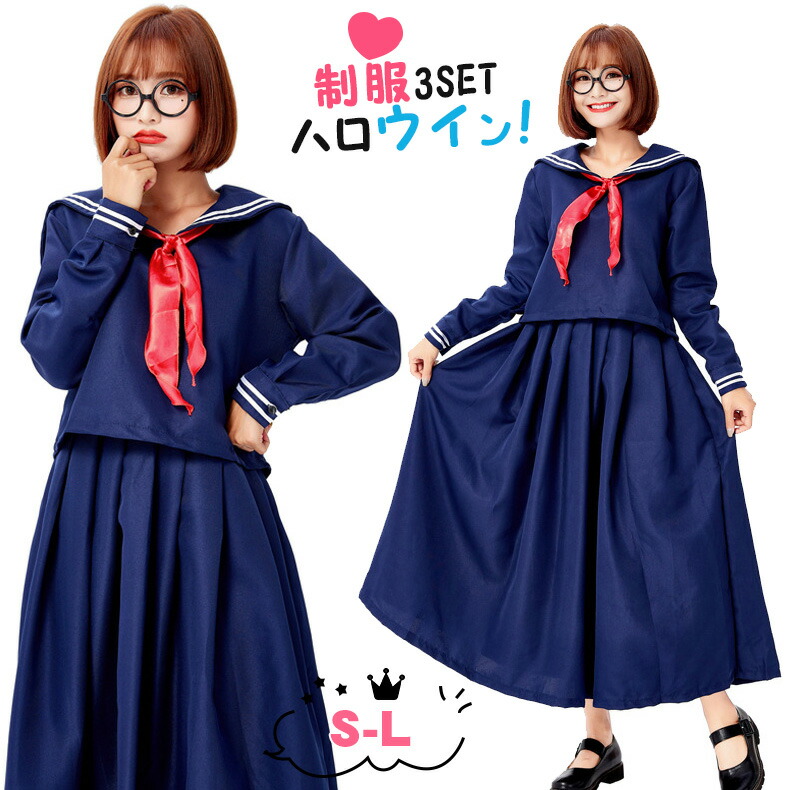 ハロウィン 衣装 セーラー服 女子高生 制服 スケバンセーラー水兵 海軍 コスプレ 大人 レディース 長袖 ロングスカート 紺 リボンプリーツ 大きいサイズ 女性用 学校祭 文化祭 イベント 水兵服