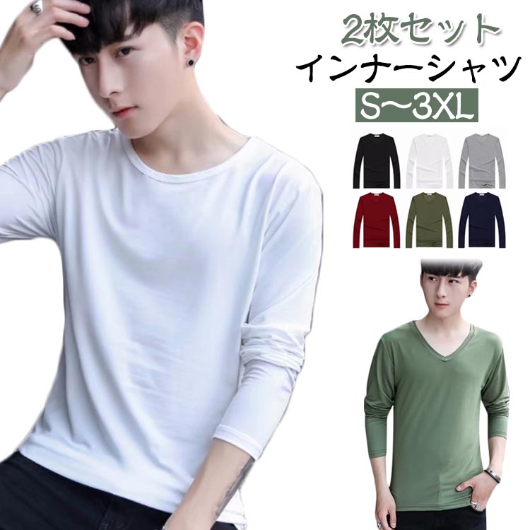 2枚セット 大きいサイズ 下着 Uネック インナーシャツ Tシャツ 長袖 丸首 紳士 Vネック クルーネック 男性用 アンダーシャツ 肌着 白 コットン V首 無地 定番 シンプル 黒
