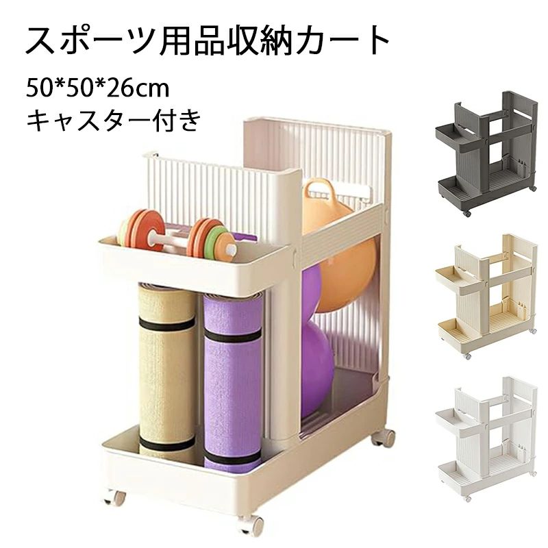 ヨガマットやフィットネス機器を整理できる多機能収納ラック。キャスター付きで移動も簡単。