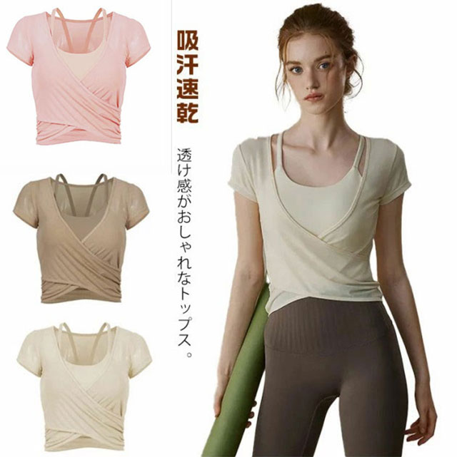 ヨガウェア トップス メッシュ カップ付き 半袖トップス レディース 吸汗速乾 薄手 ヨガシャツ ショート丈