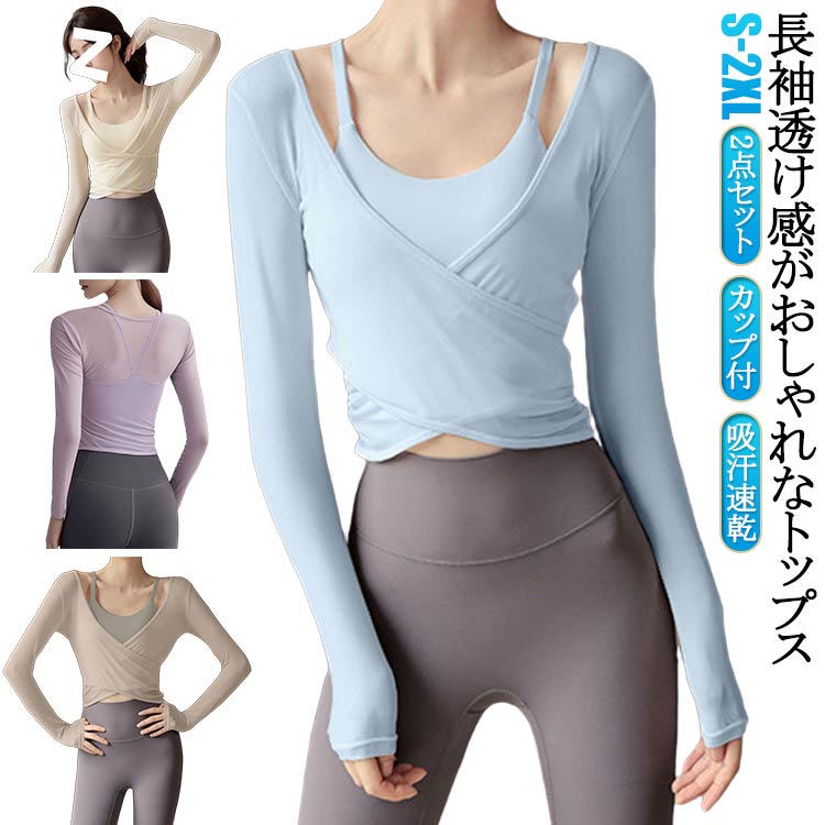 ヨガウェア トップス メッシュ カップ付き 長袖トップス レディース 吸汗速乾 薄手 ヨガシャツ ショート丈 送料無料