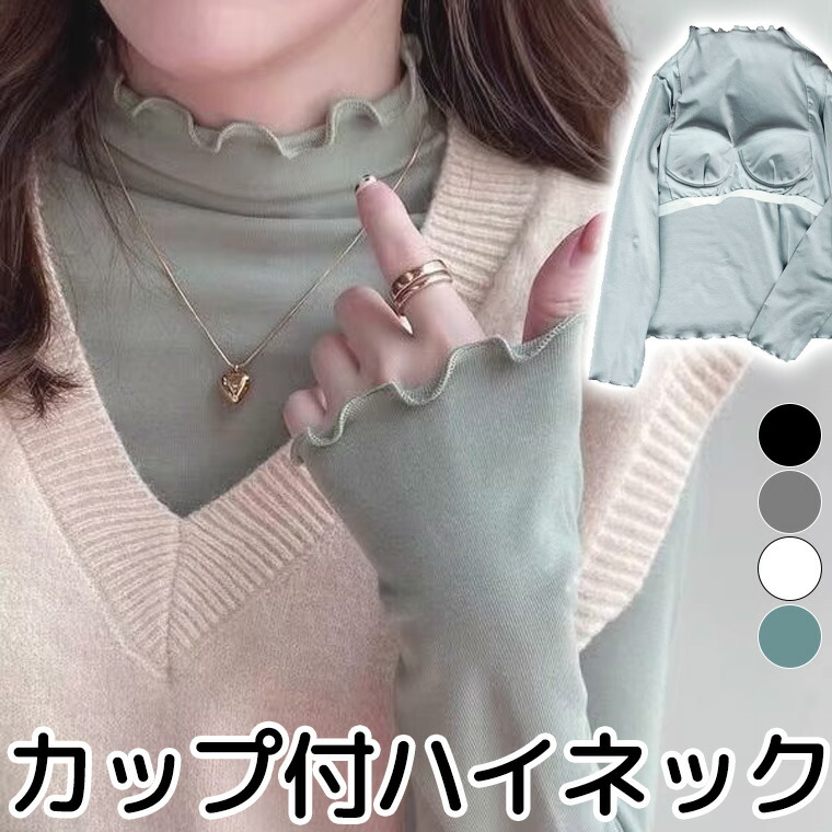 S-4XLサイズ お洒落シルエット フリルハイネック カップ付長袖 ハイネックTシャツ タートルネック アンダーフリー くしゅくしゅ ブラトップ 9分袖 10分袖 長袖 締め付けない パット ロンT